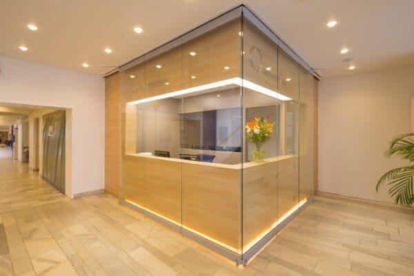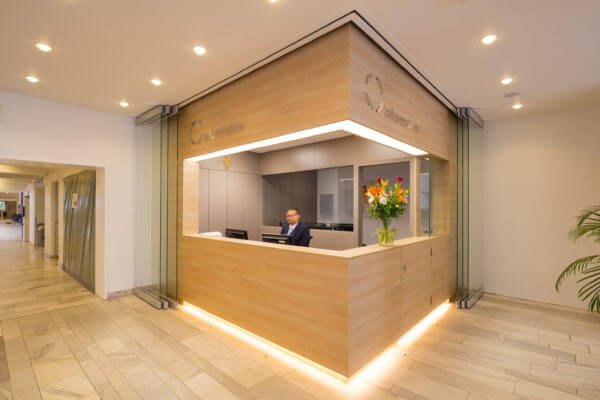 Im Zuge des Umbaus für die Kassenärztliche Vereinigung Bremen wurde auch der Informationstresen re-attraktiviert. Neben dem Concierge-Arbeitsplatz wurde im hinteren Teil des Raum im Raumkubus auch noch die Telefonzentrale untergebracht. Der Tresen wird nachts, wie ein Ladengeschäft, mittels Glasschiebewänden geschlossen.